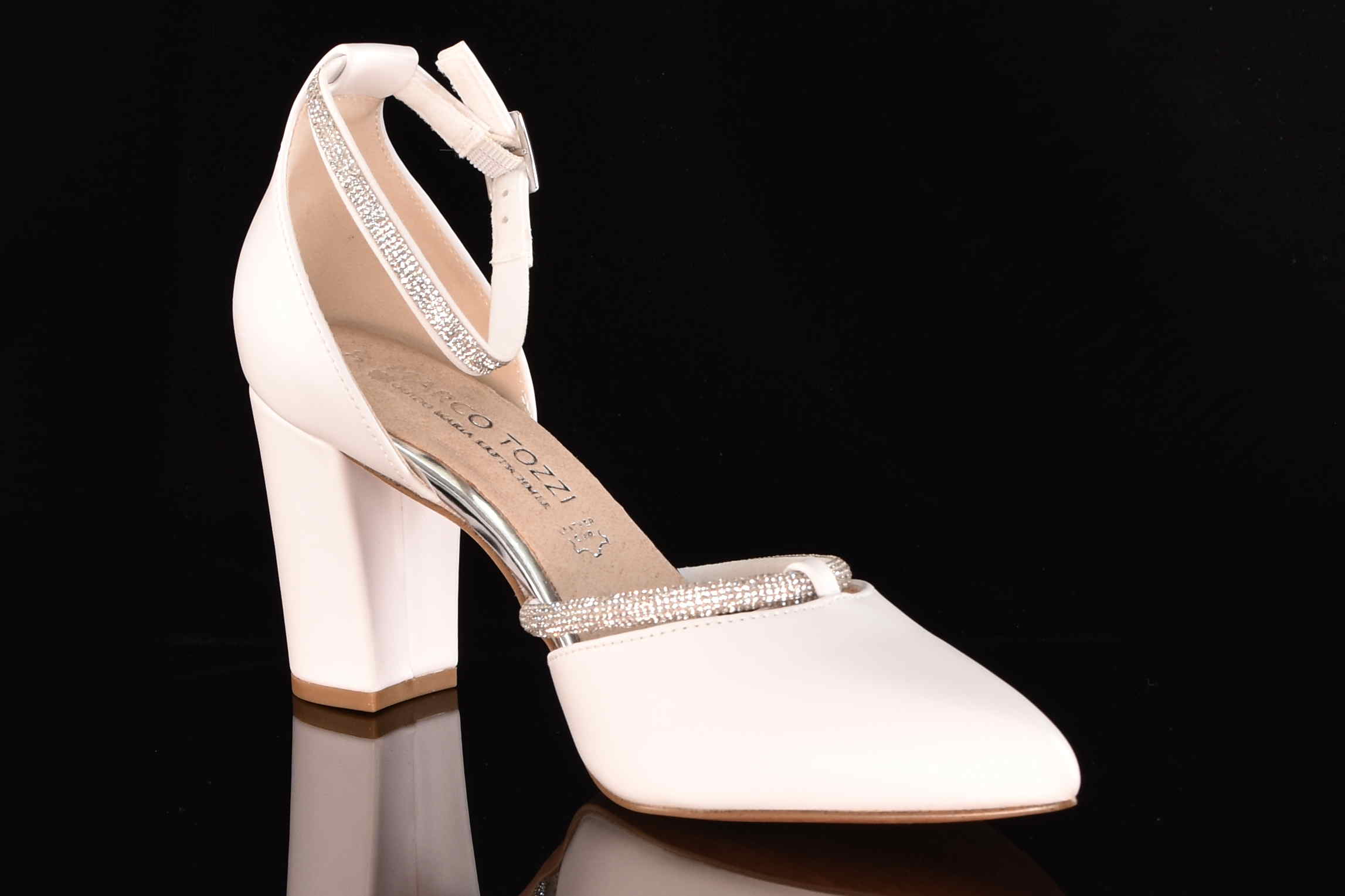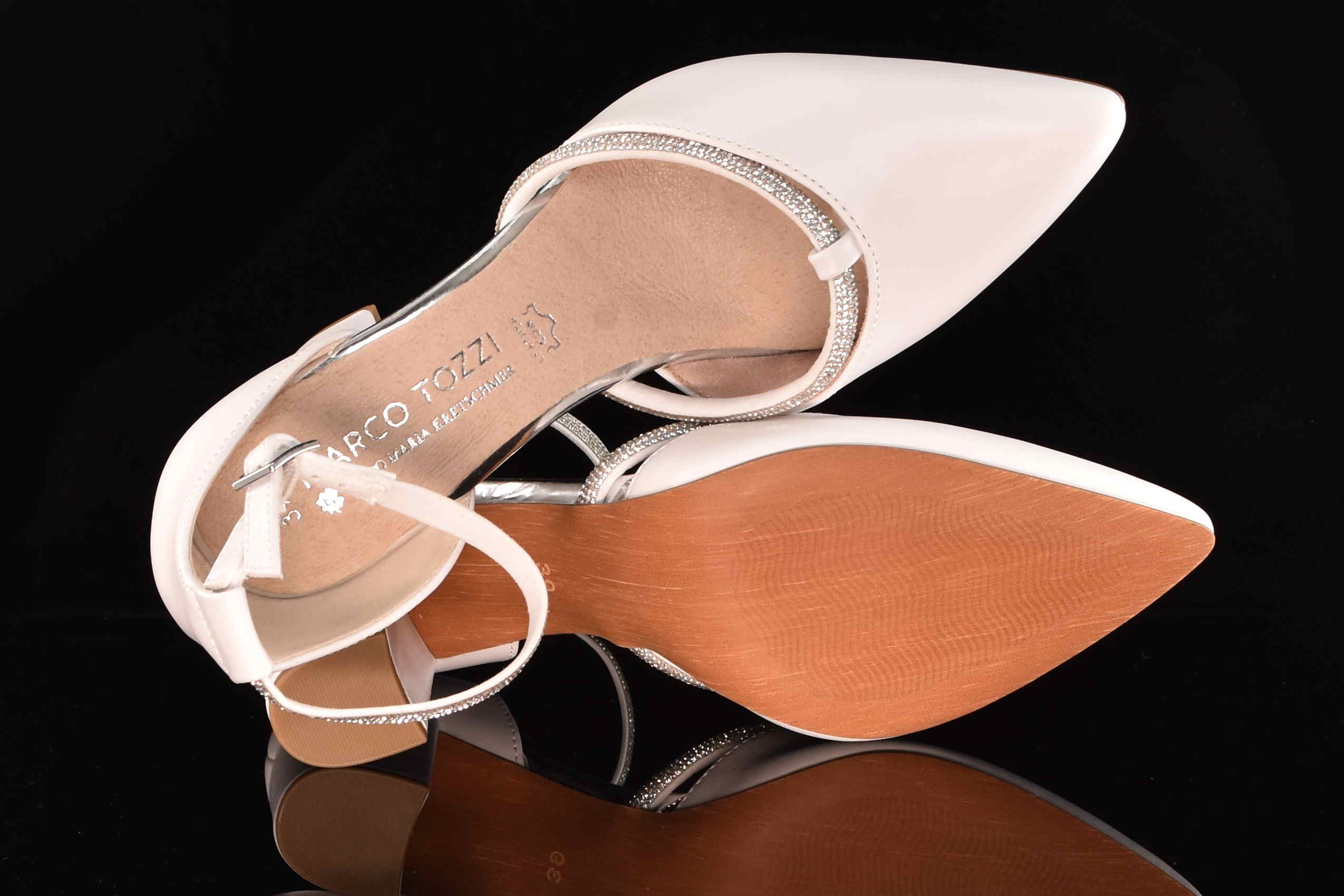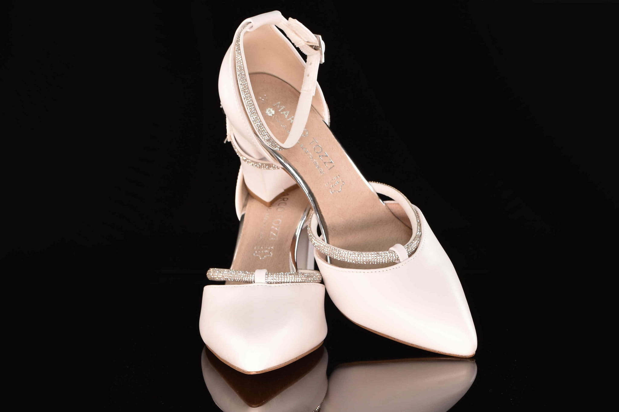 Eleganckie czółenka firmy Marco Tozzi, model 2-82404-42/940,kolor biały. Obuwie wykonane zostało z najwyższej jakości skóry i materiałów. Idealnie wyprofilowane obuwie sprawia, że nie tylko pięknie się prezentuje, ale także jest wygodne. Obcas, typu słupek-8 cm. Ozdobiony cyrkoniami paseczek przy cholewce sprawia, że obuwie prezentuje się efektownie, elegancko. Wkładka ze skóry naturalnej zapewni komfort użytkowania nawet przez wiele godzin. Tęgość G. Prezentowane czółenka będą idealnym dopełnieniem każdej eleganckiej stylizacji, także ślubnej!!!