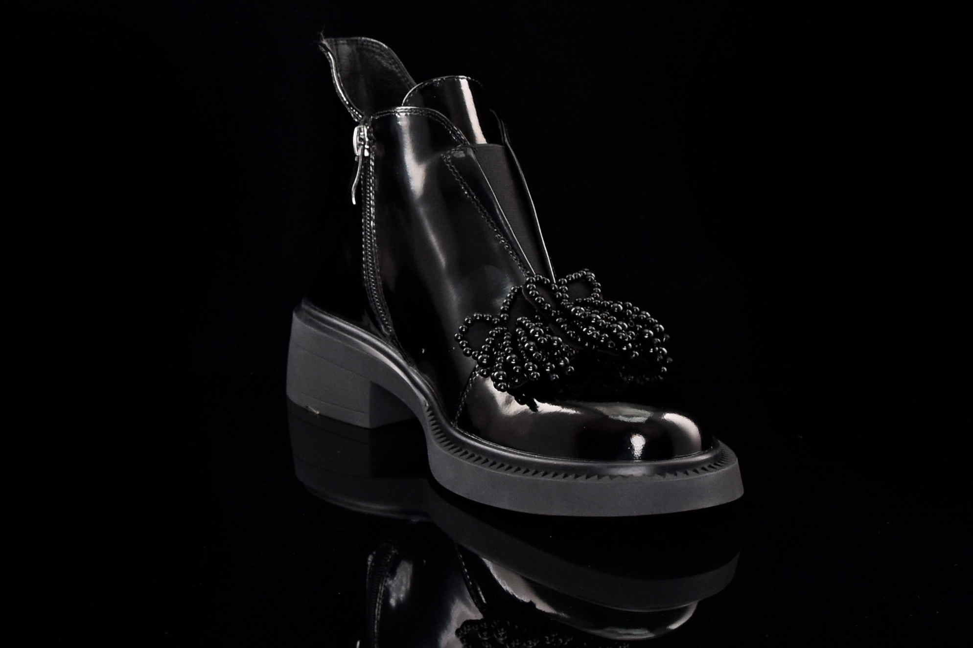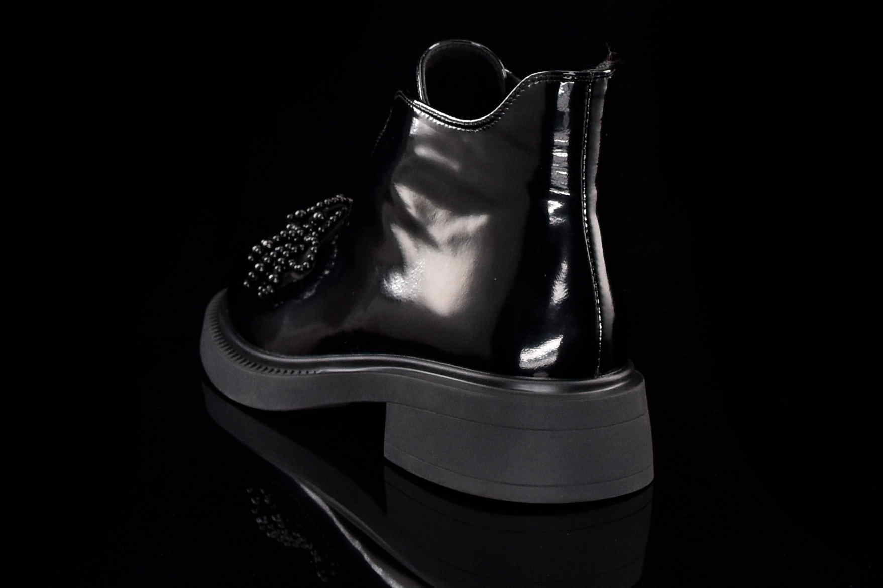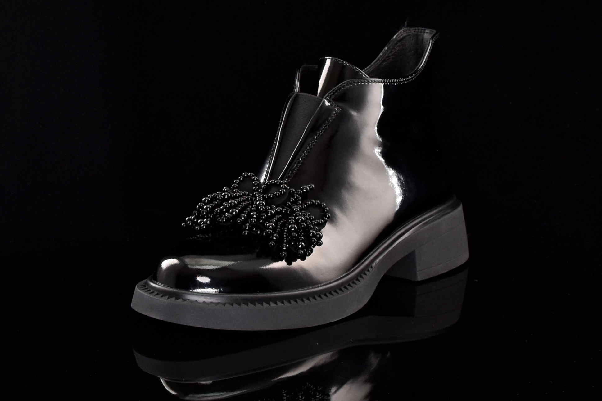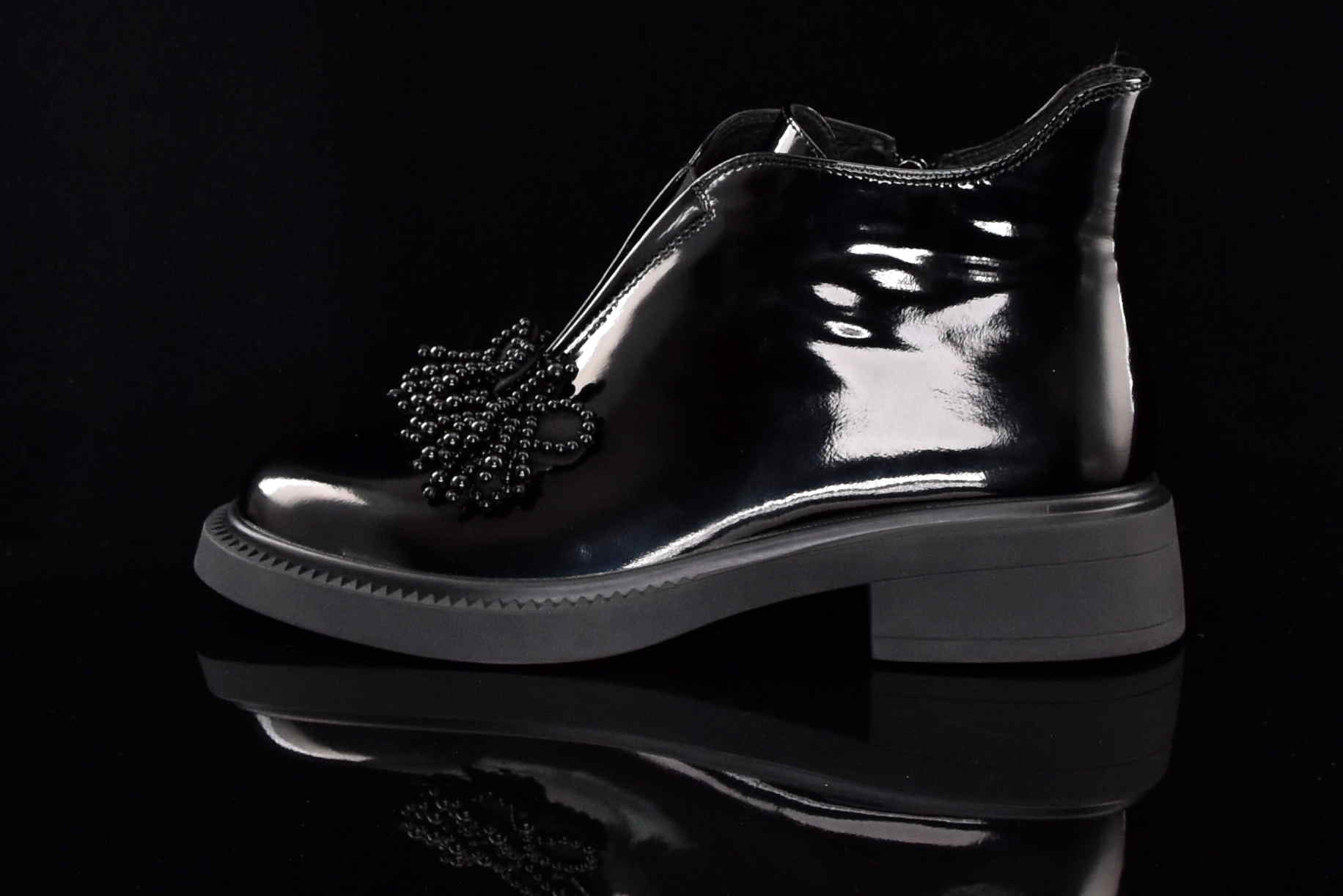 Eleganckie damskie botki wykonane z najwyższej jakości skóry naturalnej lakierowanej, które doskonale łączą klasykę z nowoczesnym stylem. Wygodny suwak z boku umożliwia szybkie zakładanie i zdejmowanie butów, zapewniając komfort noszenia na co dzień. Dodatkowym elementem, który przyciąga uwagę, jest piękna ozdoba z koralików umieszczona na cholewce, nadająca botkom unikalnego charakteru i subtelnego blasku.