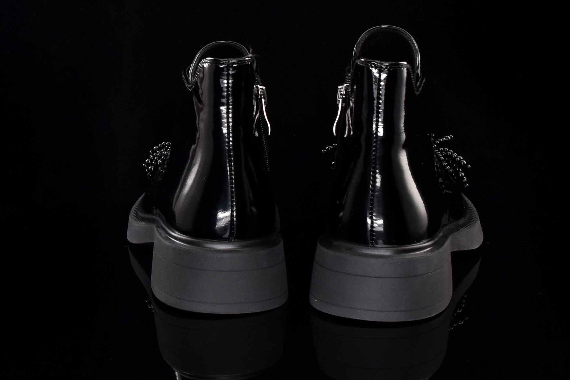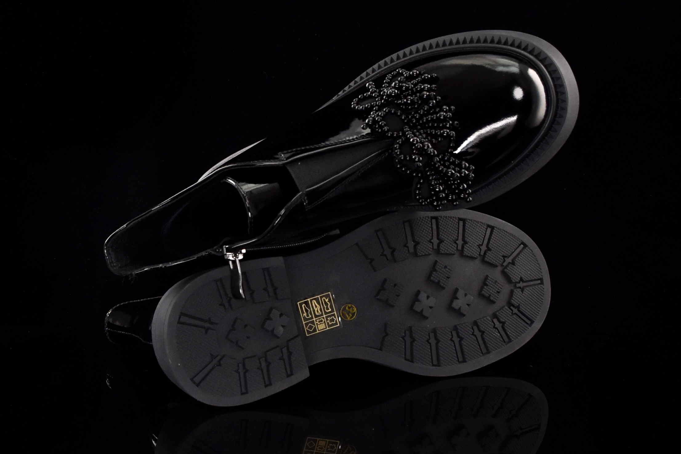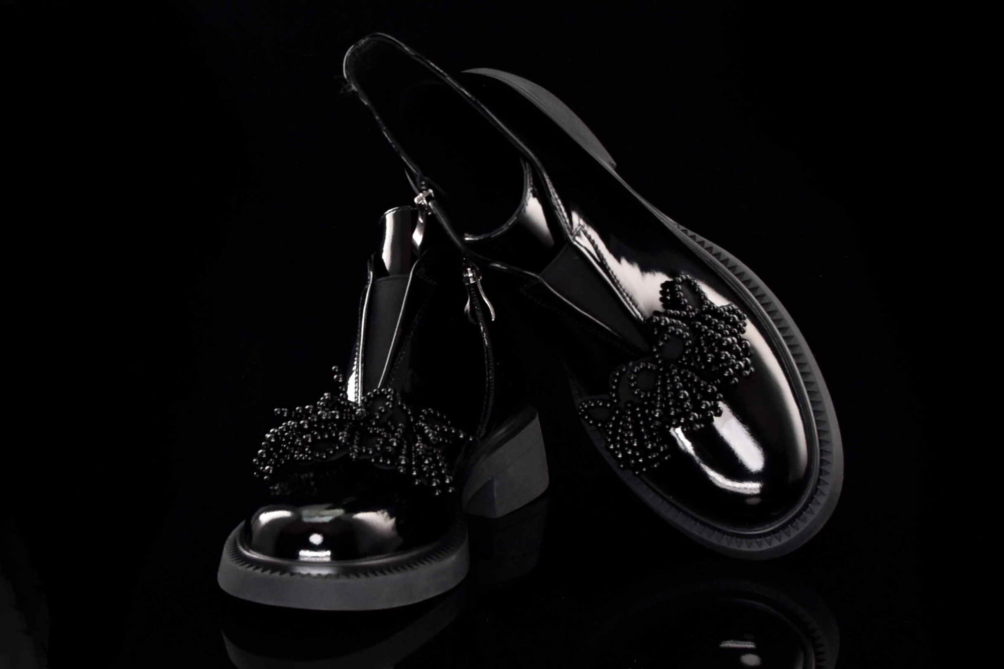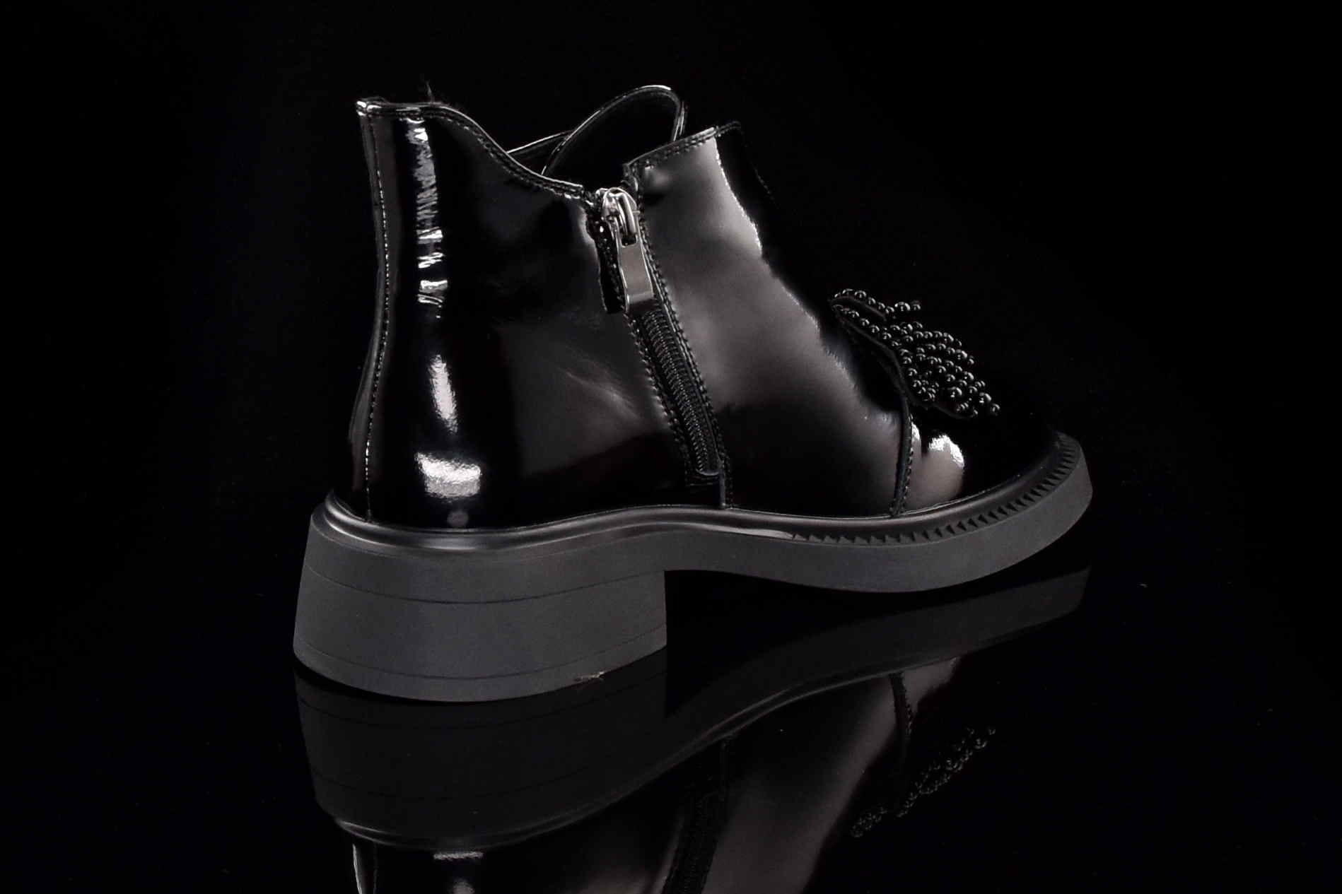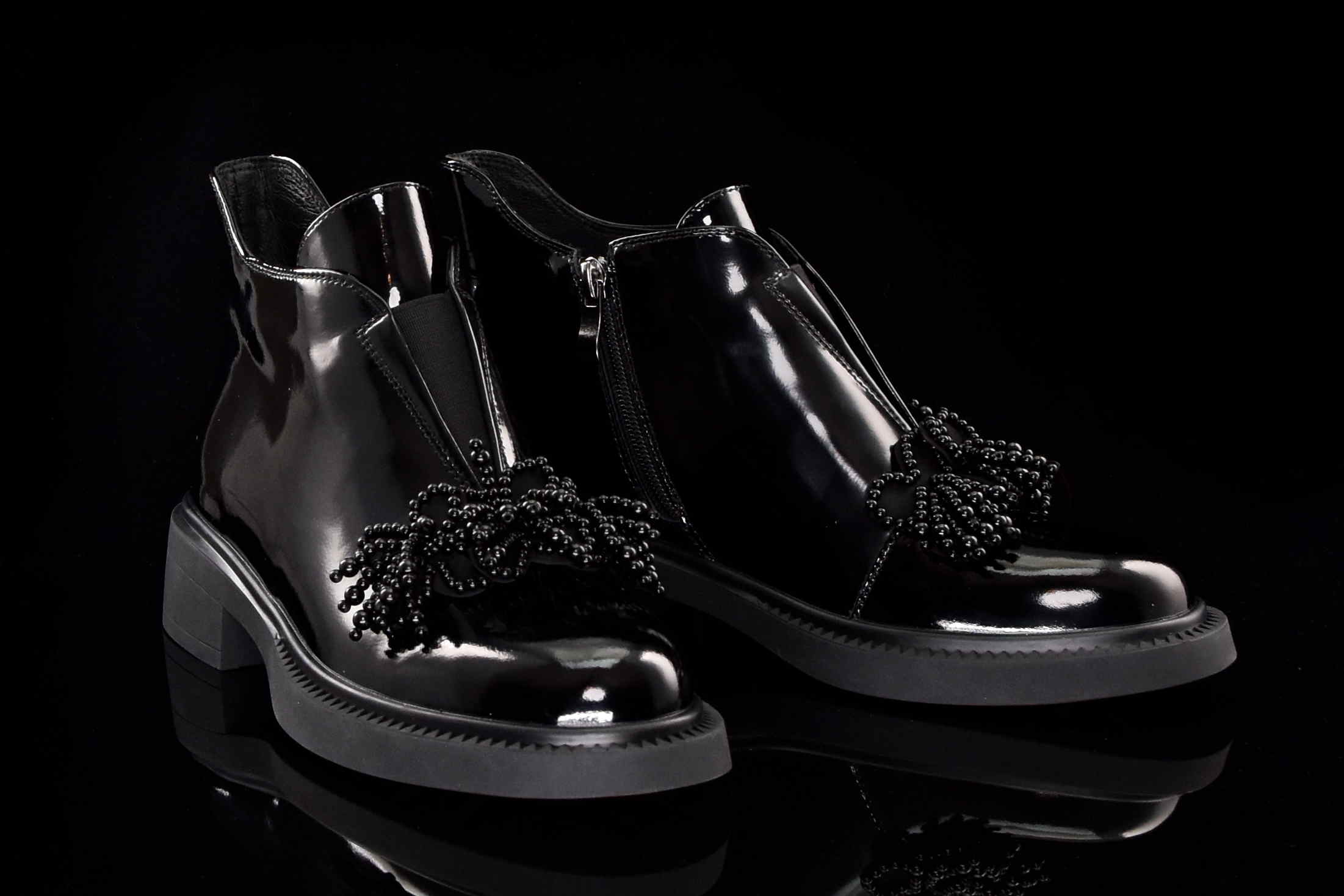 Eleganckie damskie botki wykonane z najwyższej jakości skóry naturalnej lakierowanej, które doskonale łączą klasykę z nowoczesnym stylem. Wygodny suwak z boku umożliwia szybkie zakładanie i zdejmowanie butów, zapewniając komfort noszenia na co dzień. Dodatkowym elementem, który przyciąga uwagę, jest piękna ozdoba z koralików umieszczona na cholewce, nadająca botkom unikalnego charakteru i subtelnego blasku.