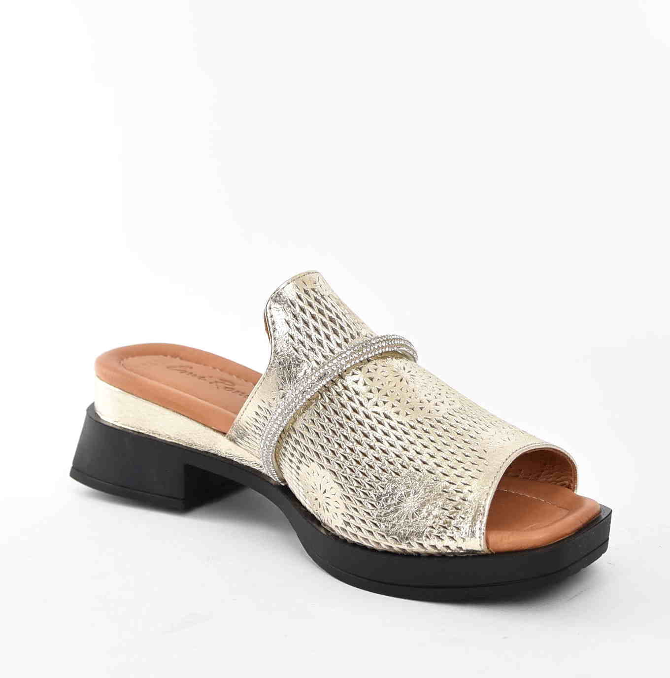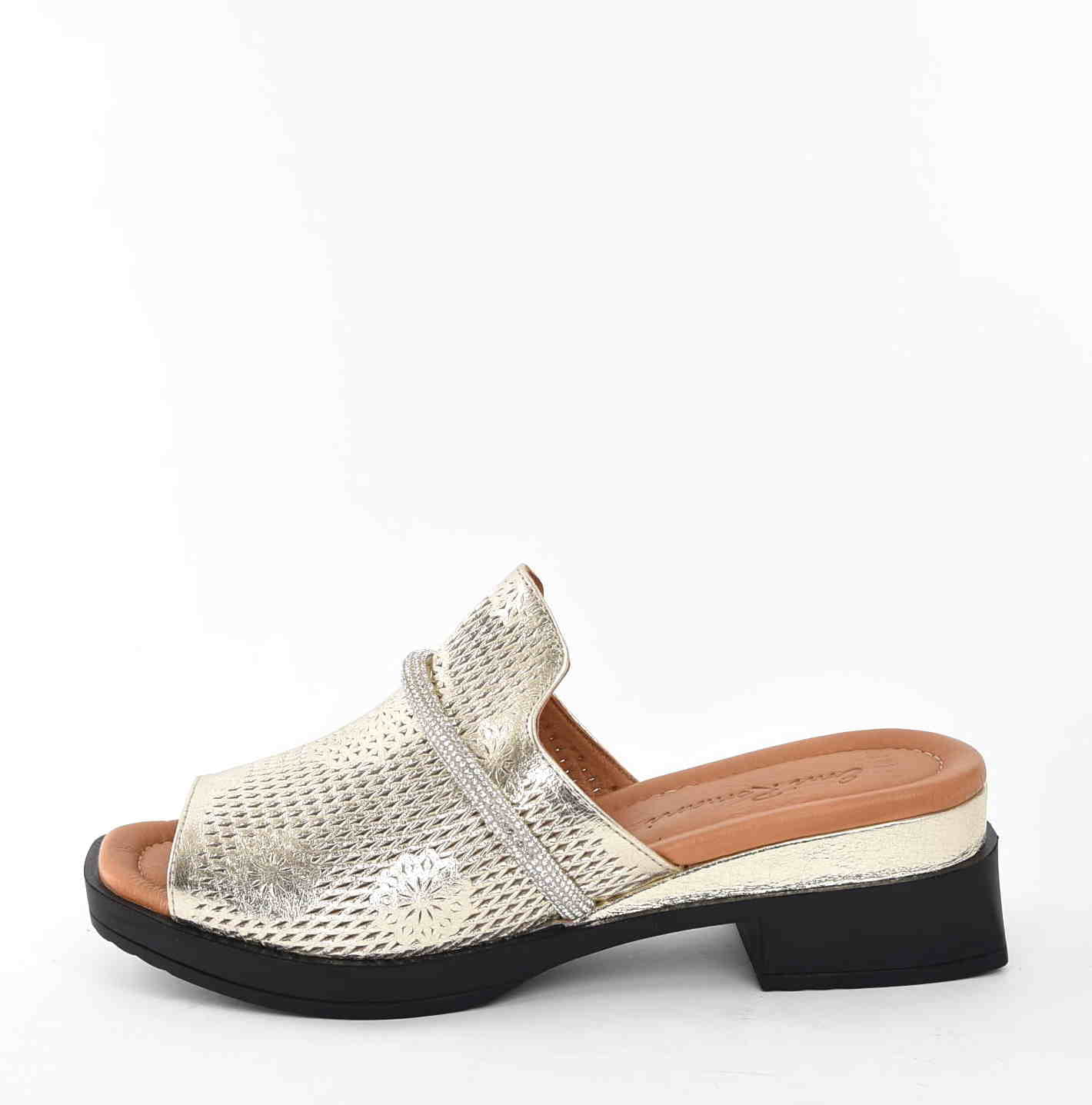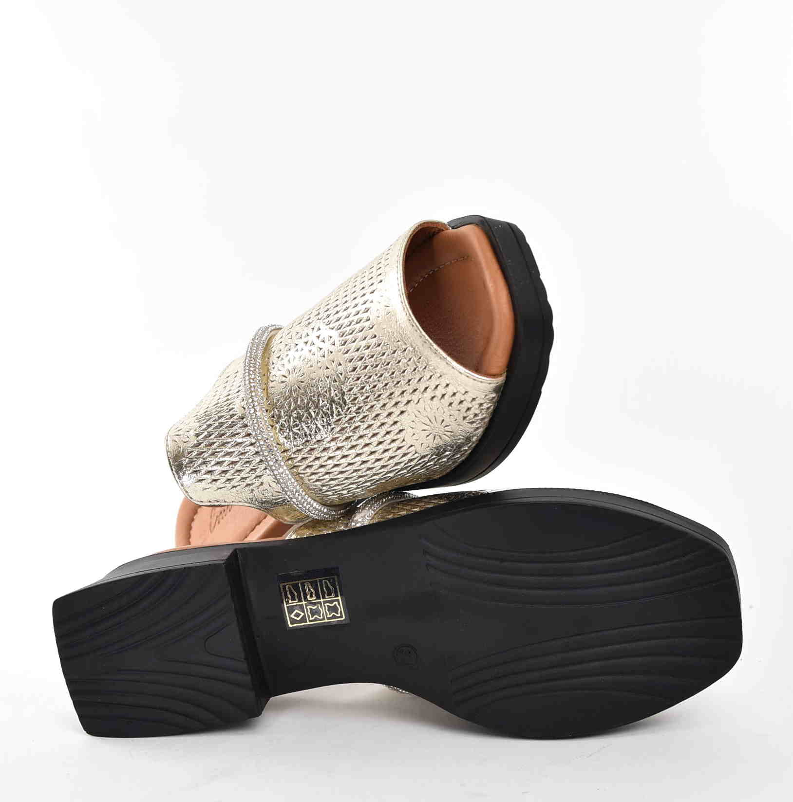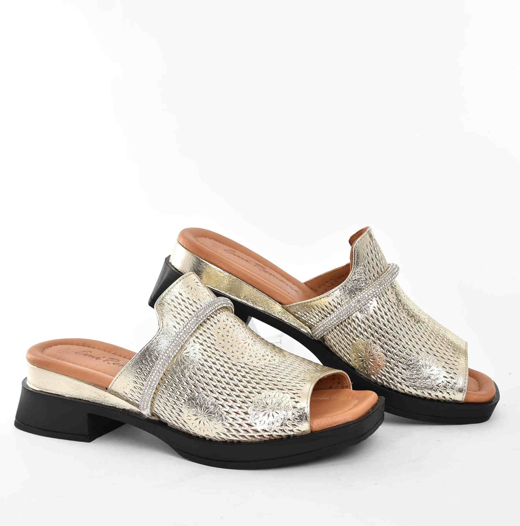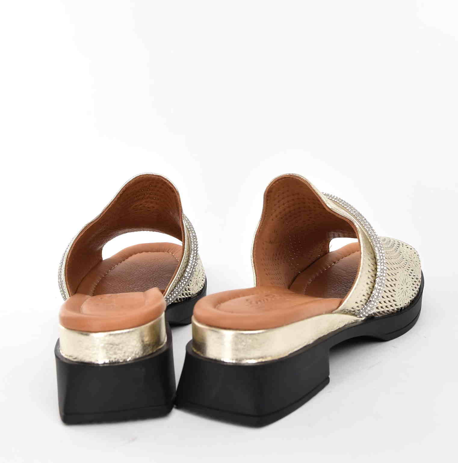 Eleganckie skórzane Klapki Damskie z Ażurem i Ozdobnym Paskiem z Cyrkoniami EMI ROMANI 080.2302 332 Gold/Złoty