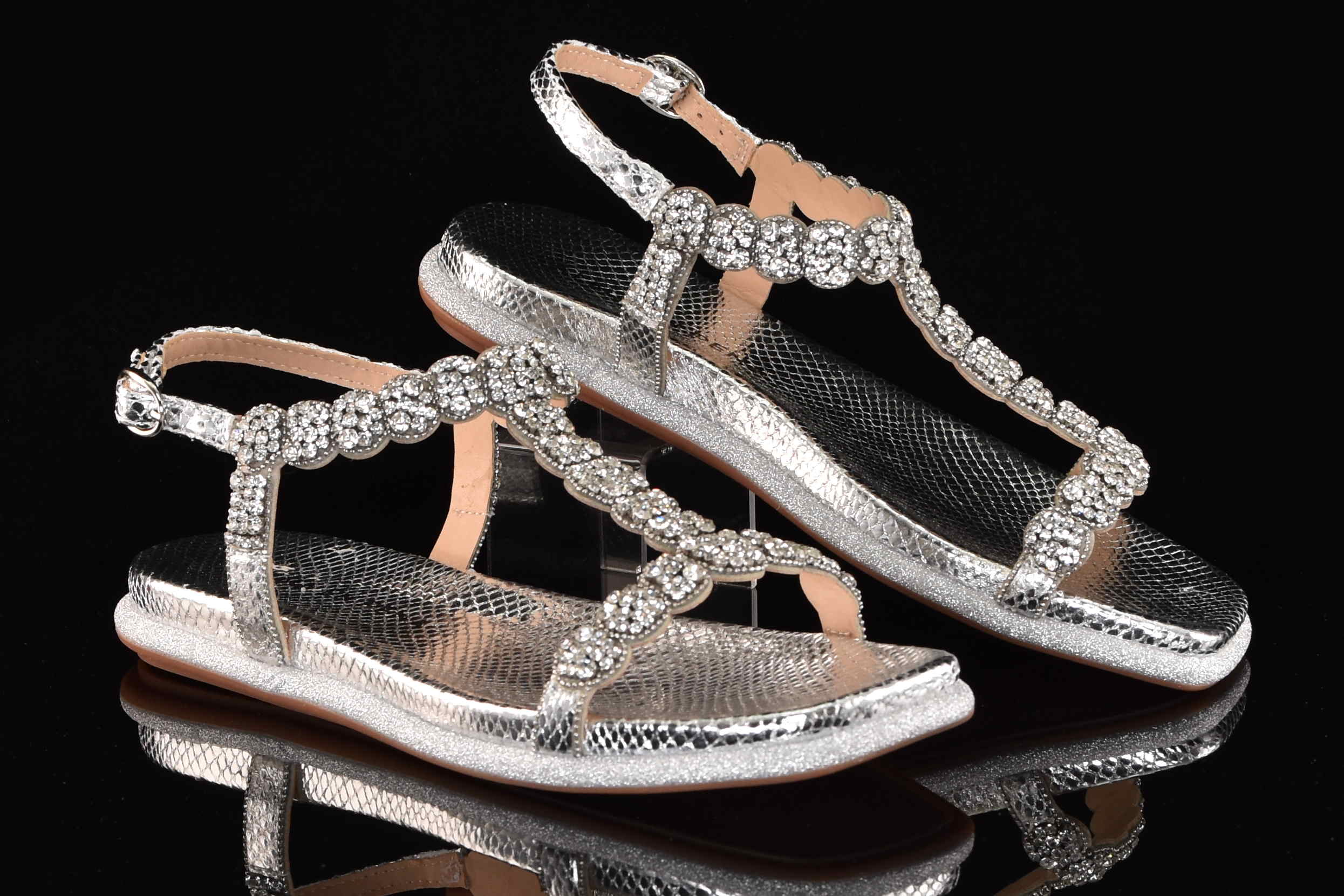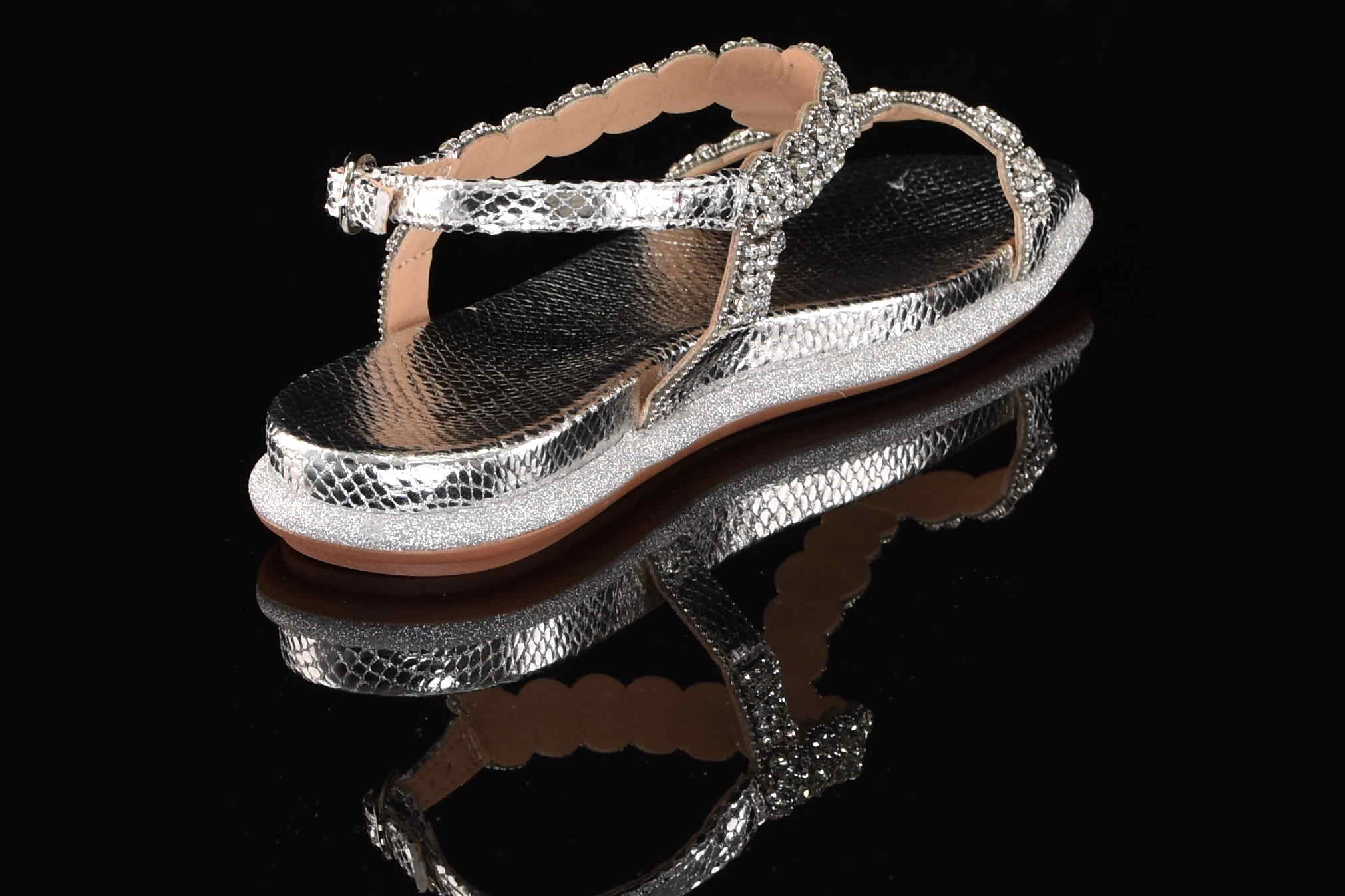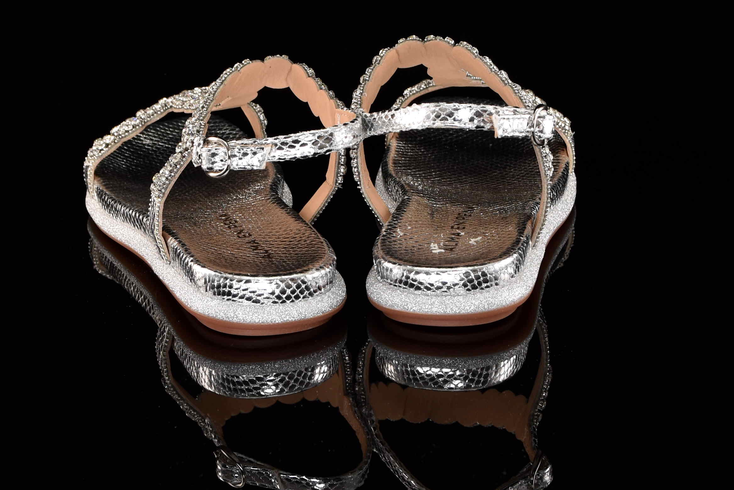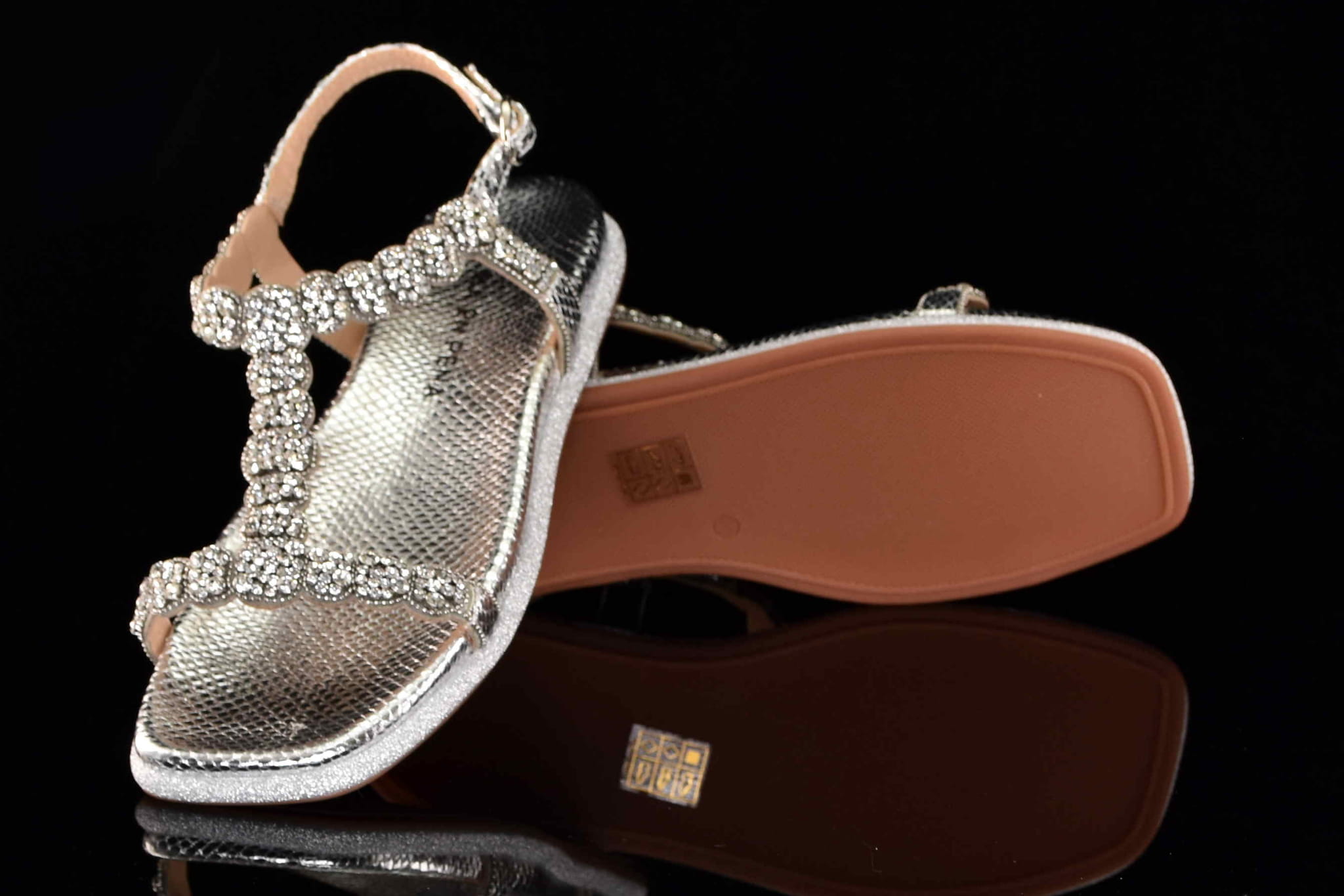 Odkryj niezwykle eleganckie i wygodne sandałki hiszpańskiej marki Alma En Pena, wykonane z wysokiej jakości naturalnej skóry. Ich metaliczne, srebrne wykończenie oraz paski zdobione lśniącymi kryształkami sprawiają, że każda stylizacja nabiera luksusowego charakteru.