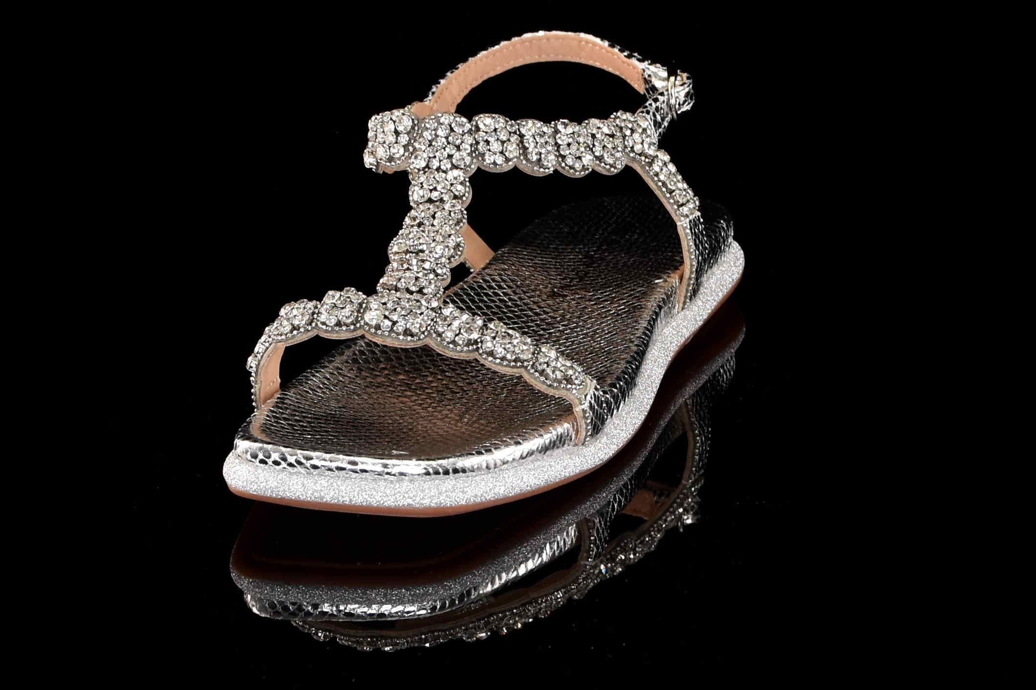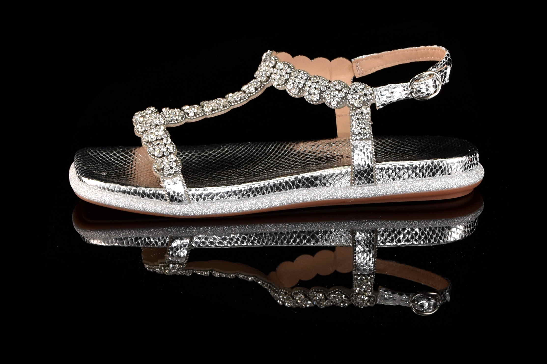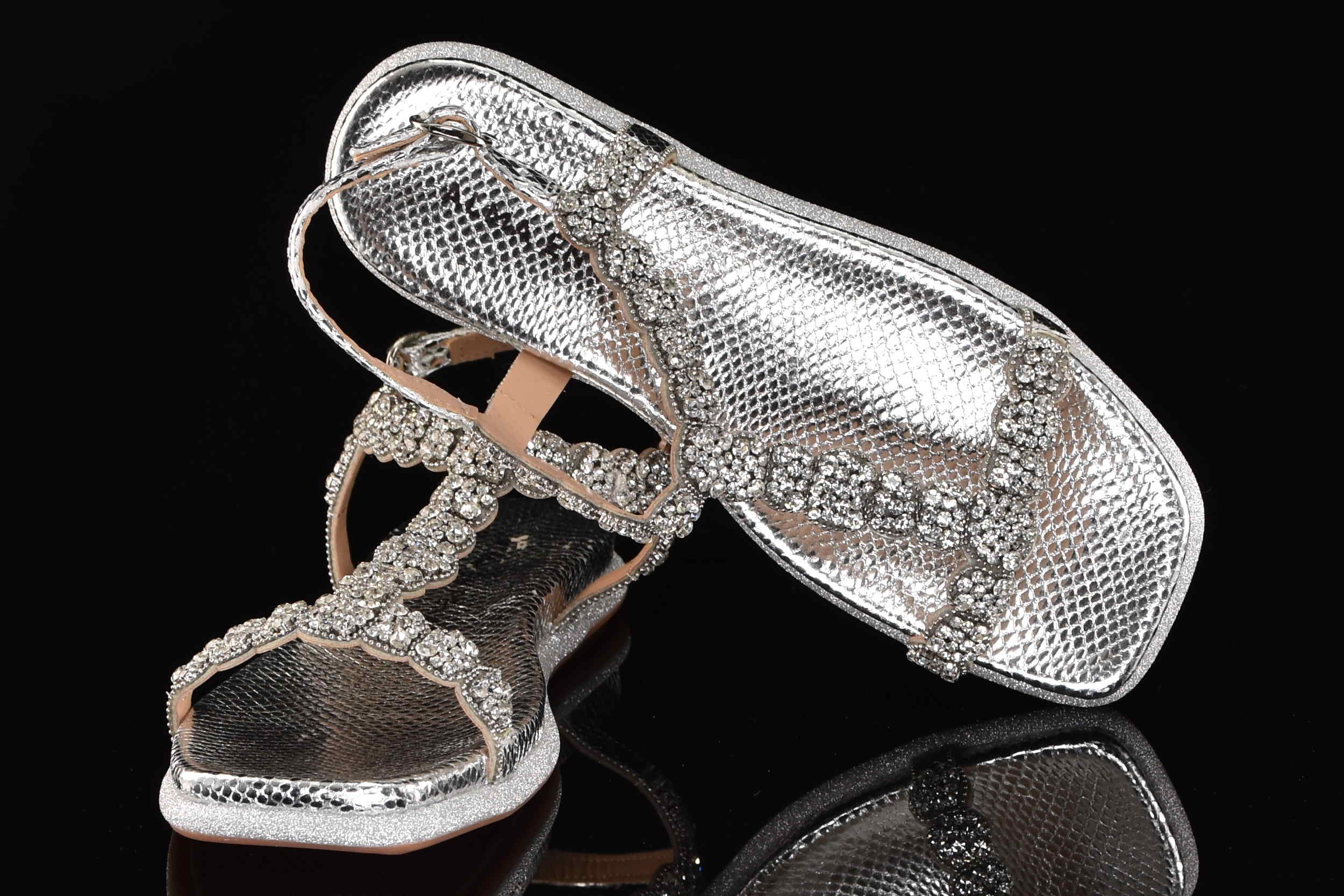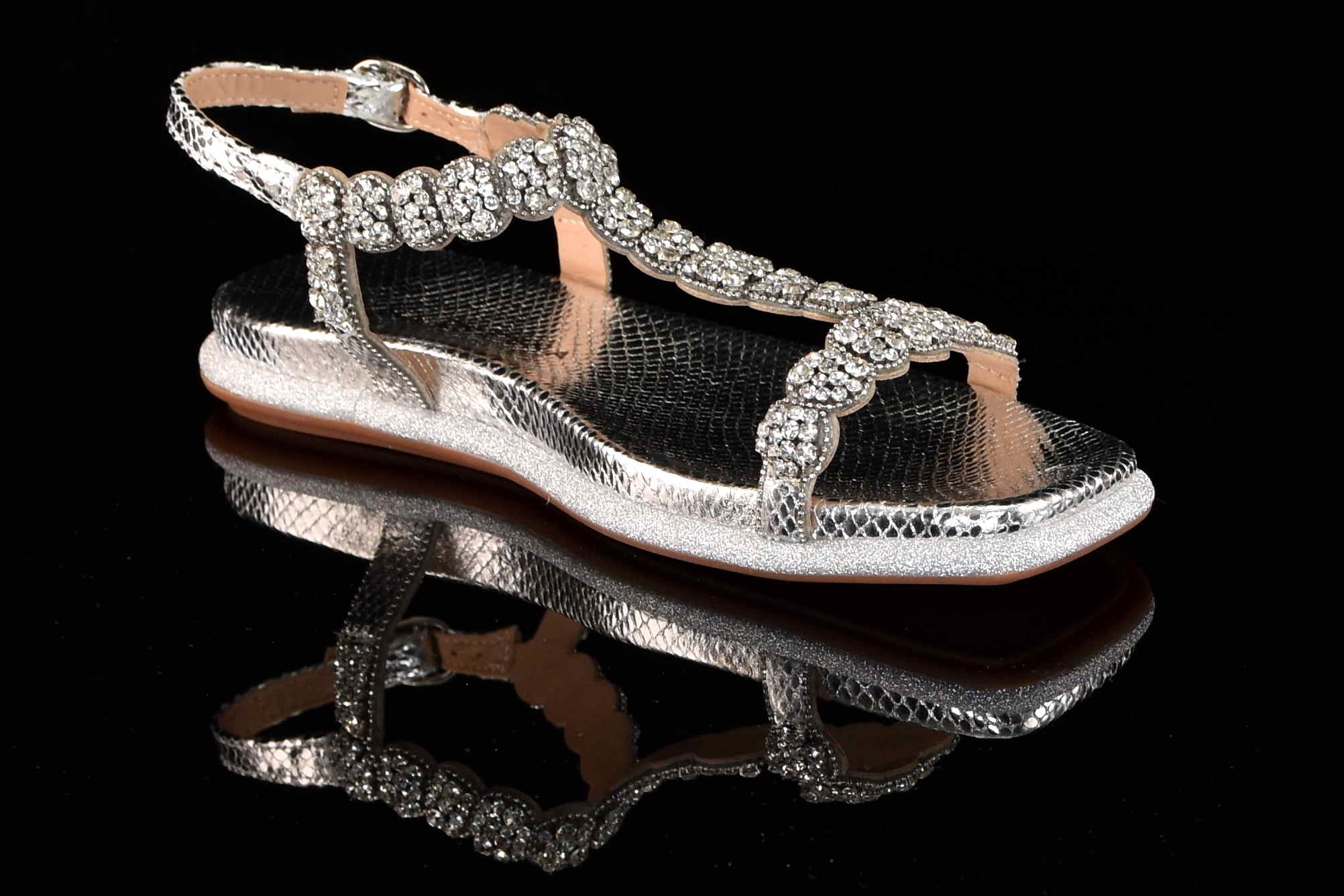 Odkryj niezwykle eleganckie i wygodne sandałki hiszpańskiej marki Alma En Pena, wykonane z wysokiej jakości naturalnej skóry. Ich metaliczne, srebrne wykończenie oraz paski zdobione lśniącymi kryształkami sprawiają, że każda stylizacja nabiera luksusowego charakteru.